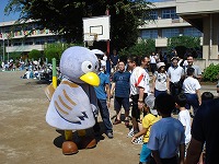 PTA競技『大人の玉入れ』が行われました。昨年までの綱引きから、玉入れ(玉を入れる所を長くして)に変更し、得点種目になりました。得点種目になったこともあり、子供たちから大きな声援が巻き起こりました。結果は、優勝チームは緑組。1点差で準優勝は赤組でした。コバトンも応援に駆けつけてくれました。