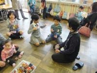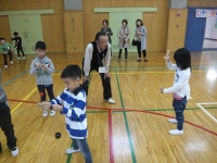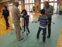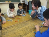 竹馬、竹とんぼ、けん玉、お手玉、あやとり、おはじき、コマ回し、メンコ、はねつきの各グループに分かれて名人先生からコツを教わりました。