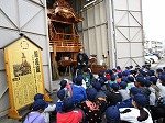 子どもたちは大きな山車に驚いていました。山車についてのお話を聞いた後、山車に乗せていただきました。今回の学習を通じて、祭りをつなぐ人々の思いを知り、より一層地域の祭りについて、興味関心をもつことができました。講師の先生方、3日間ありがとうございました。