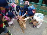 バスの中では歌を歌ったり友達と仲良く話をしたりして、あっという間にこども動物自然公園に到着しました。牛の乳搾り、モルモットやウサギとのふれ合い、おいしいお弁当、動物の見学、秋探しと、盛りだくさんの楽しい遠足になりました。