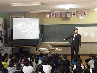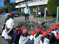 埼玉県立川の博物館の講師を招いて、理科の「流れる水のはたらき」の学習を行いました。川がどのようにできて、どんなはたらきがあるのかを丁寧に説明してくださいました。また、校庭の砂場に作った特大の山に水を流すと、どのように土地が削られ、水が流れていくのかを実演していただきました。実験結果に驚きながら、水の流れの力のすごさを実感することができました。