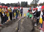 砂場に作った山に水を流して、流れる水のはたらきを知りました。また、台風による川やその周りの土地の変化の写真を見て学習を深めることができました。