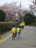 お迎え当番のお家の方に見守られ、下校班の友達と一緒に帰ります。