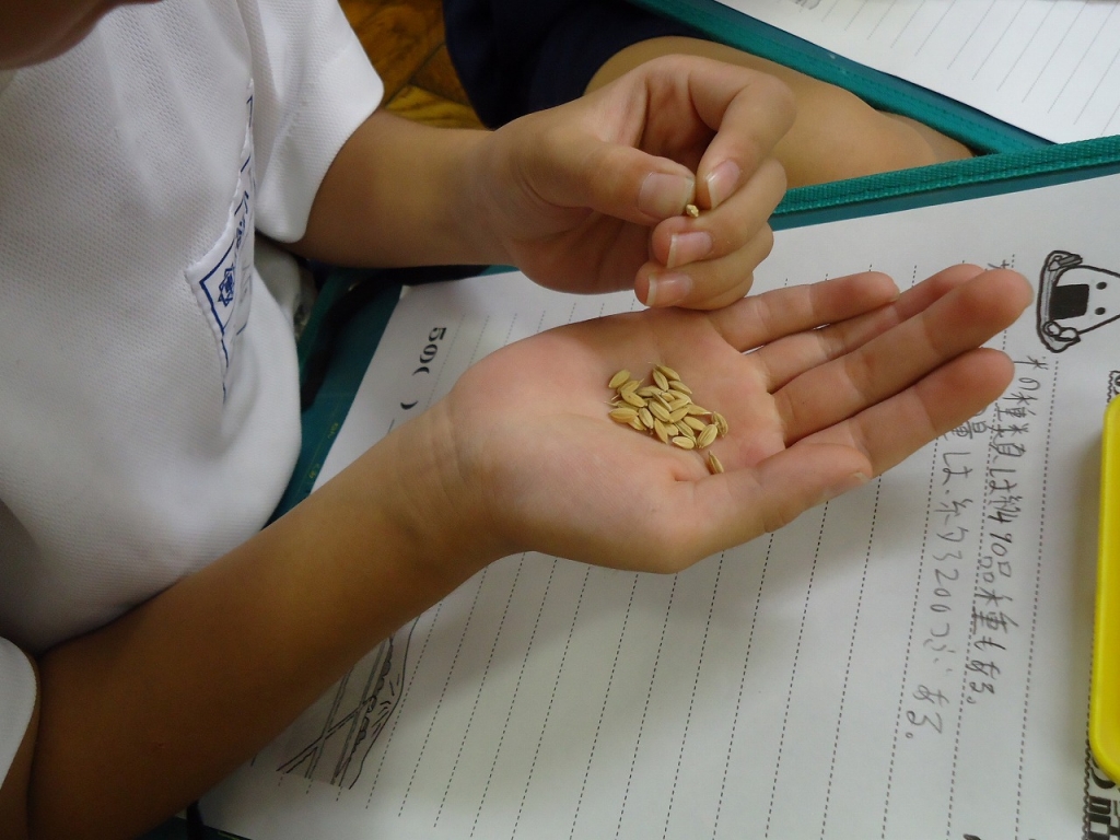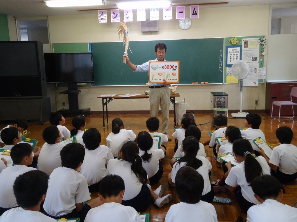 お茶わん一杯には約3200粒のお米が入っていること、昔はビンに米を入れて棒を使って苦労して精米していたことなどを学びました。
