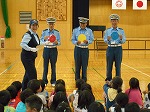 もしかして車が来るかもしれない、自転車が来るかもしれないと考えることが大切です。みんなで、「とまる・みる・まつ・たしかめる」の合い言葉を元気に復唱して、交通安全教室が終わりました。